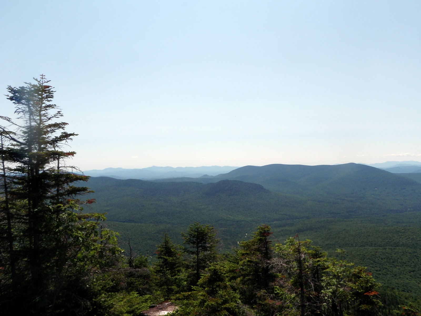 The views from ledges below the summit of Sugarloaf Mountain looking towards Teapot Mountain, Goback and Savage Mountain-East Peak, with East Mountain, Burke Mountain and Umpire Mountain in the background.